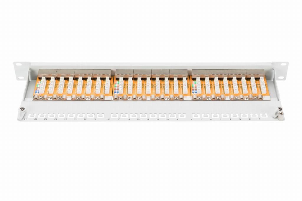 The shielded CAT 6 Patch Panel from DIGITUSĀ® is available as 16- or 24-port version. It is manufactured acc. to Link Performance Class E, for up to 250 MHz, EN 50173 and ISO/IEC 11801 and complies with the 802.3at PoE+and the 802.3af PoE standard. The housing is made of 1.5 mm galvanized cold-rolled steel and is therefore perfectly suitable for 19" rack mounting.
