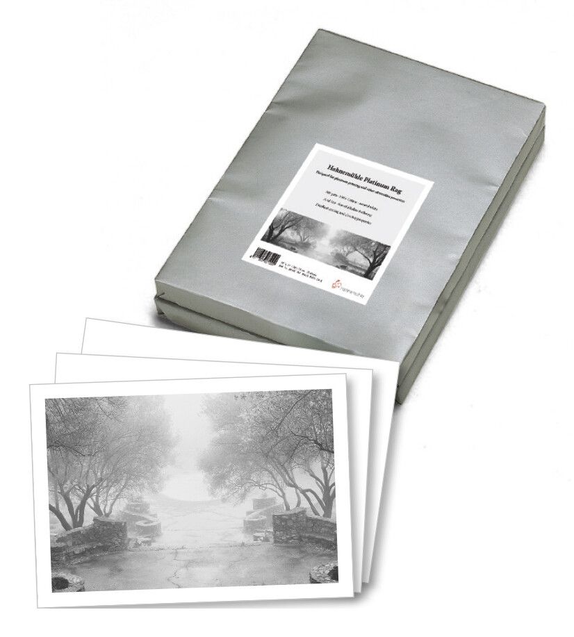 Hahnemühle Platinum Rag is an uncoated fine art paper. It is designed to meet the highest quality requirements for platinum printing and any other non-traditional photographic printing processes like Palladium, Van Dyke, Cyanotype and Salt Prints. The natural bright white paper with a weight of 300 gsm is made of 100% cotton fibres. It is acid free and does not contain any alkaline buffering. Along with the optimised sizing, the paper allows for easy coating and clearing for alternative processes.