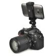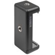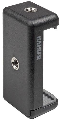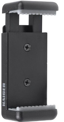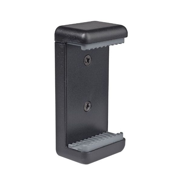 Rubberized quick clamp with 55 – 90 mm (2.2 – 3.5 in.) span width. One clamp jaw has a recess for a smartphone control key. Two ¼" tripod threads for universal application: Portrait and landscape position, photo and video shooting and viewing, video chat and smartphone operation.