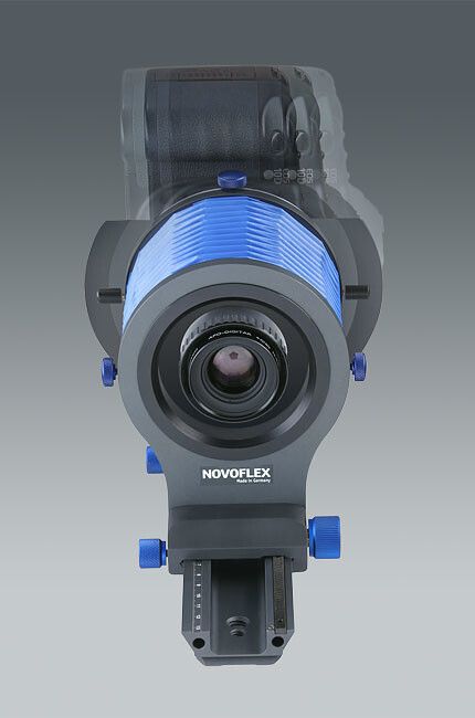 In combination with the Novoflex BALPRO 1 or BALPRO T/S universal bellows, the useful focal length is between 80 and 150 mm, with the effective focal length approximately 50% by the larger image field. In effect, the image area taken with a focal length of 150 mm corresponds to a single image taken at about 80 mm. At the same time, the sometimes unwanted increase in focal length is more than compensated for by the smaller chip size.