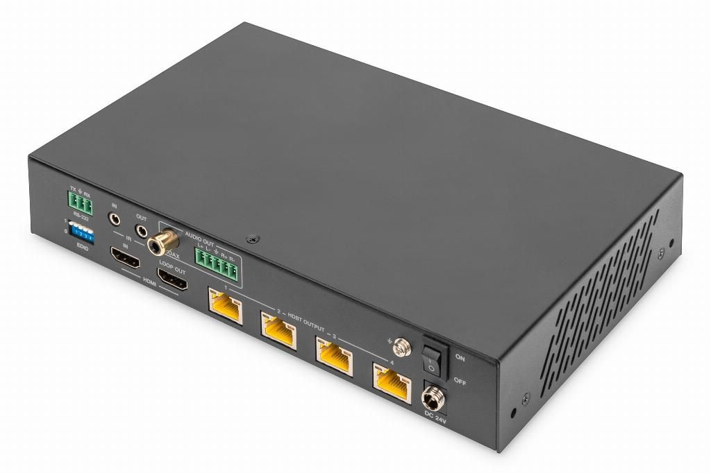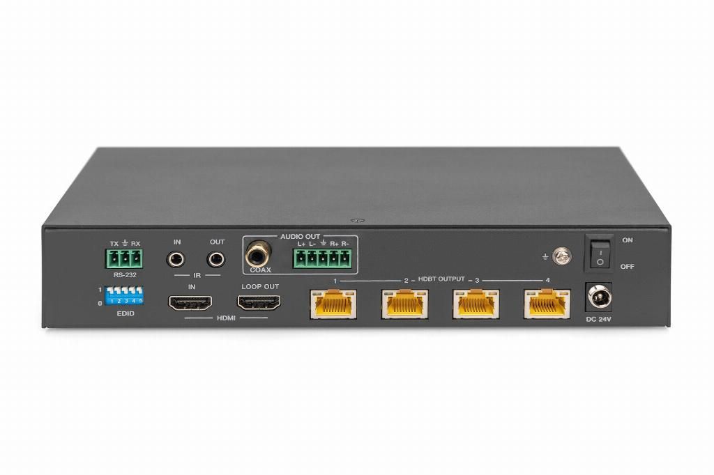 The DIGITUS® 4K HDBaseT™ HDMI Extender Splitter Set distributes the input signal on up to four output devices over a distance of up to 120 m (4K/60Hz, 4:4:4) or up to 150 m (Full HD, 1080p/60Hz) using a CAT6/7/8 cable. Supports IR and RS232 signal transmission, audio extraction (digital/analog) and EDID management. Thanks to PoC functionality, only the transmitter needs to be externally supplied with power. Using the HDMI loop-out to the transmitter unit, a local monitor can be connected in order to control the output to the receiver.