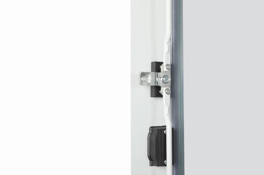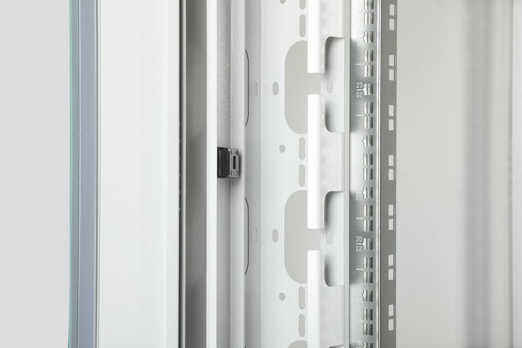 The network cabinets in the Unique series have been designed and produced for particularly convenient and flexible network cabling. Sophisticated optimizations offer market-compliant stability with maximum flexibility. A modular base chassis, which can be opened using screwed 483 mm (19") blind panels, offers sufficient space for cables of all kinds. In addition, there are side cable inlets with brushes at the top and bottom of the enclosure, as well as another at the rear of the base chassis. Rear brush strips above and below the rear door (from 26U) enable use in a wide range of application scenarios. Generous vertical cable ducts with cable routing aids and cover, installed in the front (from 800 mm enclosure width), perfectly round off the versatile features of the network enclosure. Two pairs of cranked and galvanized 483 mm (19") profile rails, labelled with height units that can be read in opposite directions, are installed inside. They are infinitely adjustable and are connected to additional depth struts in the cabinet. Each enclosure is a robust steel construction made from sheet steel up to 1.5 mm thick. The coloring takes the form of electrostatic powder coating in the standard colors grey (RAL 7035) and black (RAL 9005). Modular lockable and removable side panels and doors improve accessibility. Door hinges can be changed. Furthermore, the cabinets can be completely dismantled if required thanks to the demountable design.