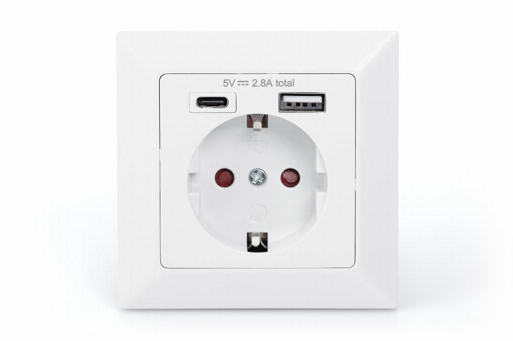 Charge your smartphone at any socket! With the DIGITUS® safety plug socket you can even charge 2 smartphones at the same time. Charge one USB-C™ or USB A device with up to 14 W (5 V / 2.8 A). For example, with 2.8 A available charging current you can simultaneously charge your smartphone and tablet. Protect you and your family by the integrated shutters in the safety socket and inbuilt electronic short circuit and overload protection in the USB ports. Upgrade your existing electrical installations and enjoy being able to charge your USB devices at any time, directly from the socket.