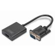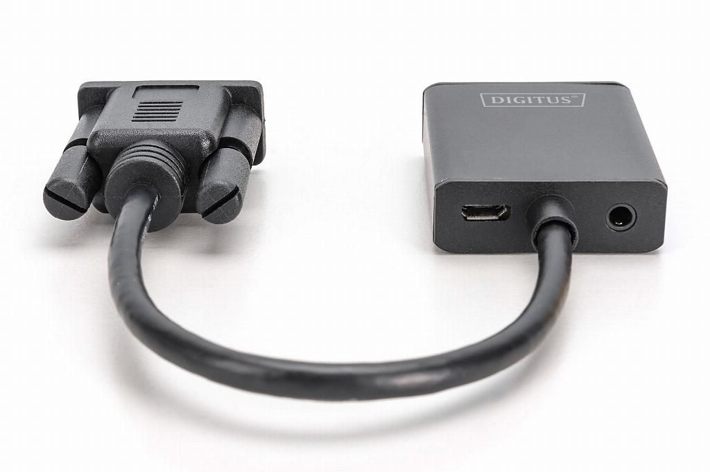 The Digitus VGA to HDMI Converter converts your analog VGA signal to a digital HDMI signal. The conversion enables you to easily connect devices having only a VGA port to an HDMI monitor, a TV set or a projector. The converter is equipped with a 3.5 mm audio jack since the VGA input can play back only a video signal. Any existing stereo signal is simultaneously converted and integrated into the HDMI signal. This makes it possible to play back the audio signals via HMDI on your TV set.