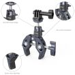 SmallRig Super Clamp Camera Mount Clamp with 360° Ballhead 4102B is made of aircraft-grade aluminum alloy and stainless steel, CNC process anodized and carved to increase sturdiness and durability. It features skeletal design and shark clamp with stronger clamping force as well as widely compatible 1/4"-20 threaded holes and 3/8"-16 threaded holes. The clamp, which supports rod of a minimum diameter of 14mm and surface with a maximum thickness of 65mm, can quickly attach cameras, monitors, LED video lights, etc. to round pipes, tables, handlebars, tripods and stabilizer handheld rings. Anti-slip threads help ball head lock easily and one-piece connection secures ball head mount to the clamp to prevent disconnection. In addition, built-in cushions provide protection and clamping stability. This item also includes a removable action camera adapter, with a special holder and a long rod screw to work with GoPro Hero 11 / 10 / 9 Black Camera Cage 3084C or Camera Cage for DJI Osmo Action 3 4119.