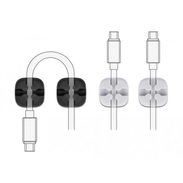 Questi portacavi Delock consentono di ordinare in modo chiaro e preciso i cavi esposti. Sono autoadesivi e si possono facilmente attaccare a qualsiasi superficie liscia, come una scrivania o una parete.