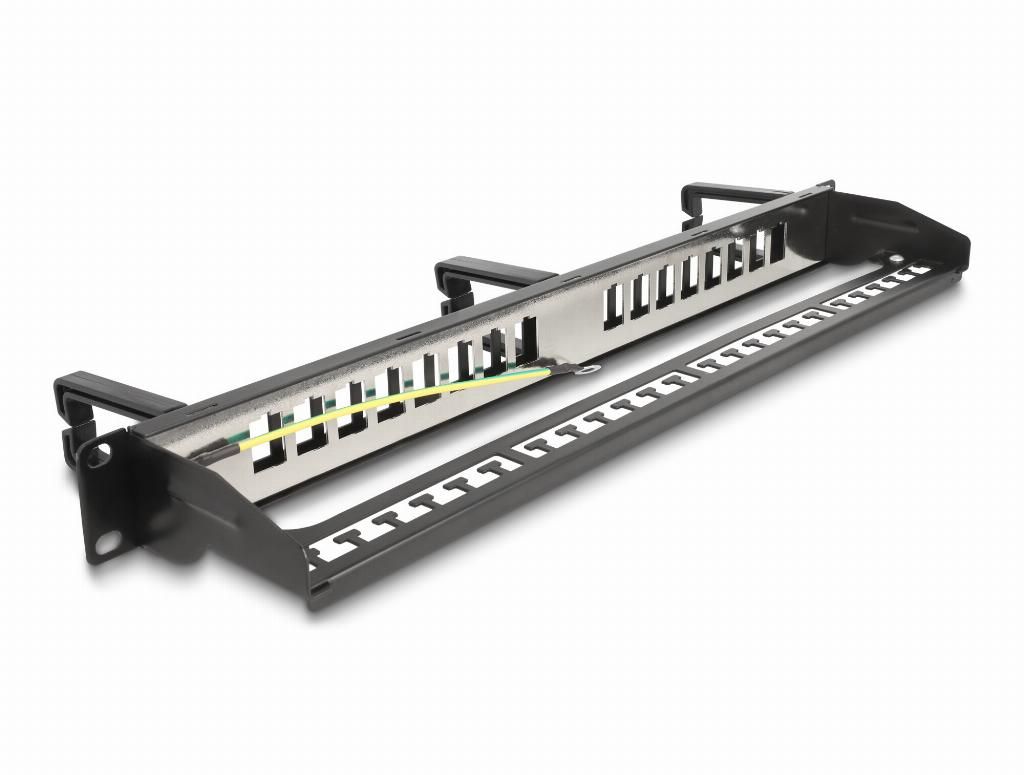 Questo pannello patch Delock può essere montato in un armadio da 19″. Con le sue dimensioni standardizzate, è adatto per un montaggio semplice a scatto di 16 moduli Keystone.