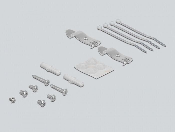 Questo pannello patch Delock può essere usato come scatola di giunzione a muro o in armadi. Inoltre, sono incluse le clip per il montaggio su guida DIN.