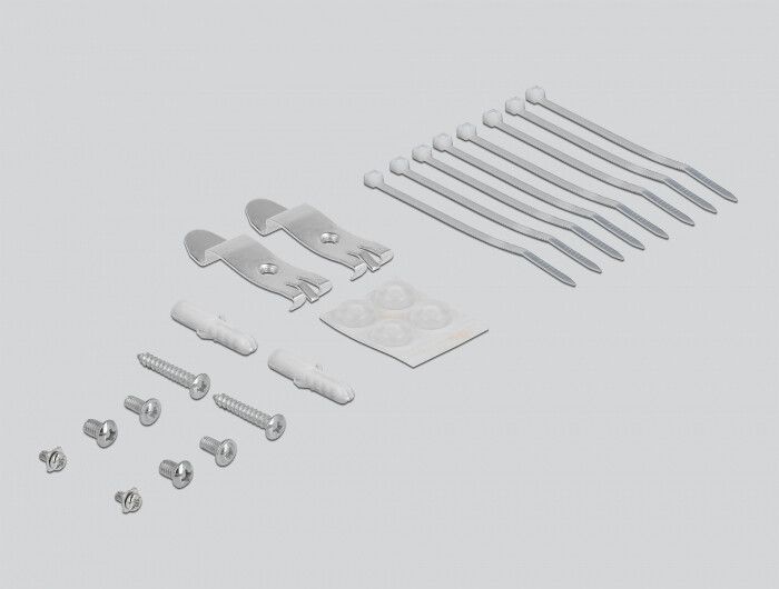 Questo pannello patch Delock può essere usato come scatola di giunzione a muro o in armadi. Inoltre, sono incluse le clip per il montaggio su guida DIN.