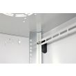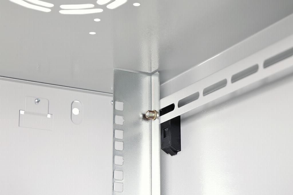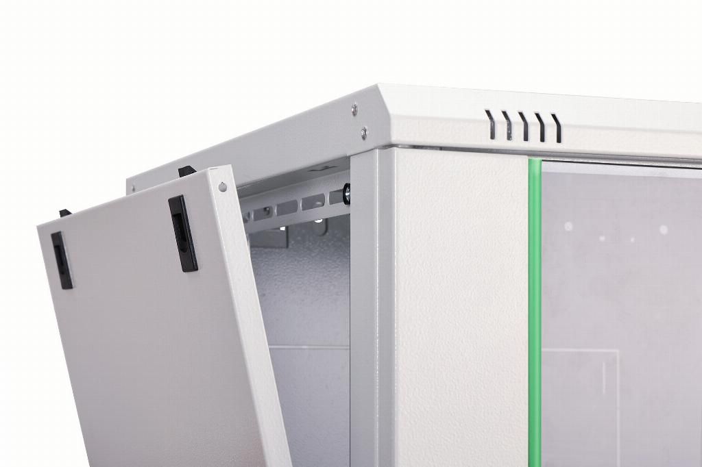 Gli armadi di rete della serie Dynamic sono stati sviluppati per un ampliamento della rete semplice e dai costi ottimizzati. Il tetto, il fondo e la parete posteriore di ciascun armadio sono dotati di un ingresso cavi pretagliato. Per l’alloggiamento di un modulo ventilatore il telaio sul tetto è dotato di una zona perforata. All’interno sono installate due coppie di guide galvanizzate da 483 mm (19"), etichettate con unità rack leggibili in entrambe le direzioni. Queste si possono regolare in profondità . Ciascun armadio è realizzato in una struttura in acciaio robusta con una lamiera spessa fino a 1,5 mm. La colorazione avviene sotto forma di verniciatura a polvere elettrostatica nei colori standard grigio (RAL 7035) e nero (RAL 9005). Le pareti laterali rimovibili e lo sportello anteriore richiudibile e rimovibile migliorano l’accessibilità . Le cerniere possono essere sostituite. Il montaggio a parete ha luogo in due semplici passaggi: La lamiera di montaggio in dotazione viene avvitata alla parete e poi collegata all’alloggiamento.