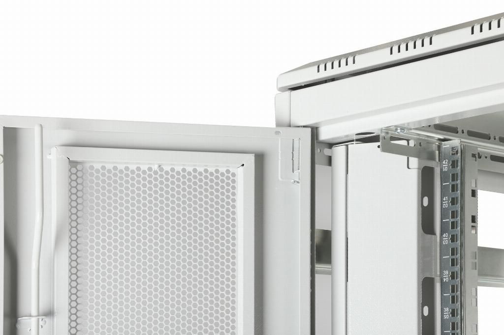 Gli armadi di rete della serie Unique sono stati progettati e prodotti per un cablaggio di rete particolarmente comodo e flessibile. Le sofisticate ottimizzazioni offrono una stabilità conforme al mercato e la massima flessibilità. Il telaio di base modulare, che può essere aperto con pannelli ciechi avvitati da 483 mm (19"), offre spazio sufficiente per cavi di ogni tipo. Inoltre, sono presenti ingressi laterali per i cavi con spazzole nella parte superiore e inferiore dell'involucro, oltre a un altro sul retro dello chassis di base. Generose canaline verticali con ausili per il passaggio dei cavi e coperchio, installate nella parte anteriore (a partire da 800 mm di larghezza dell'armadio), completano perfettamente le caratteristiche di versatilità dell'armadio di rete. All'interno sono installate due coppie di guide profilate da 483 mm (19"), zincate e con etichetta con unità di altezza leggibili in direzioni opposte. Sono regolabili in continuo e sono collegate a montanti di profondità aggiuntivi nell'armadio. Ogni armadio è una robusta struttura in acciaio realizzata con lamiere di spessore fino a 1,5 mm. La colorazione è a polvere elettrostatica nei colori standard grigio (RAL 7035) e nero (RAL 9005). I pannelli laterali e le porte modulari, bloccabili e rimovibili, migliorano l'accessibilità. Le cerniere delle porte possono essere sostituite. Inoltre, grazie al design smontabile, gli armadi possono essere completamente smontati se necessario.