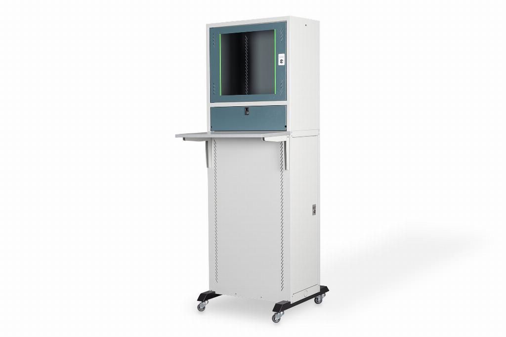La postazione di lavoro mobile con armadio di rete integrato di DIGITUS® è stata progettata principalmente per un utilizzo flessibile in uffici, grandi magazzini, ospedali, laboratori, alberghi o sale conferenze. Ogni armadio è diviso in tre unità . L’unità schermo chiudibile viene utilizzata per alloggiare un monitor o simili. Una scatola per tastiera chiudibile permette di conservare in sicurezza i vostri dispositivi di immissione quando non vengono utilizzati. Grazie ai fori per cavi in entrambi i lati è possibile utilizzare quotidianamente i dispositivi collegati quando la scatola è chiusa. La base della postazione di lavoro mobile è chiudibile in entrambi i lati ed è dotata di una mensola fissata. In questo modo è possibile alloggiarvi una stampate o dispositivi simili. Inoltre, ciascuna postazione di lavoro mobile è dotata di un tavolo ribaltabile efficiente per un uso quotidiano. Ciascun armadio è realizzato in lamiera spessa fino a 1,5 mm e garantisce una struttura in acciaio robusta grazie alla speciale tecnologia di piegatura della lamiera per un’ottimale stabilità .